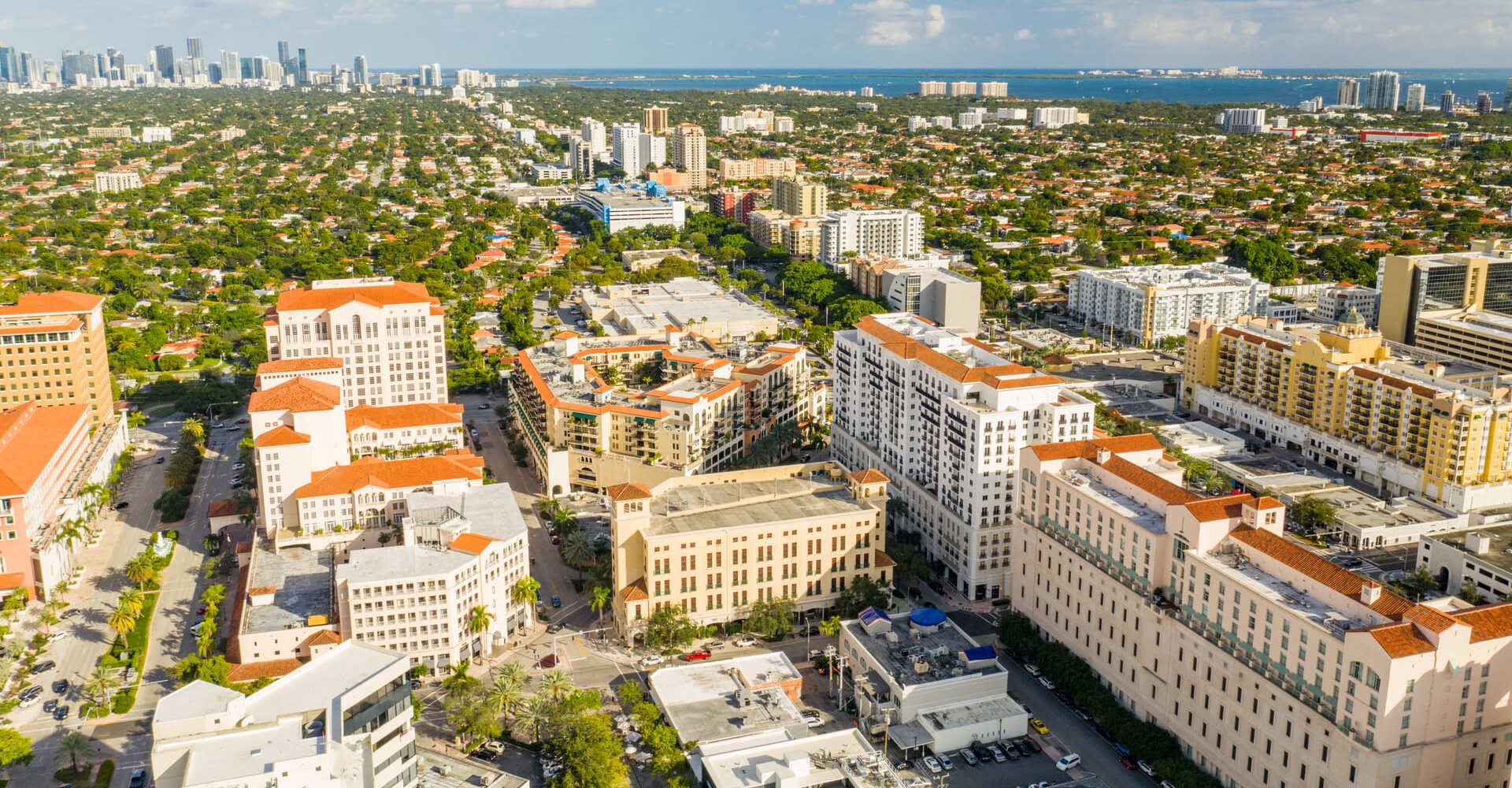 Cityscape view of the luxury mediterranean style town of Coral Gables in Miami.